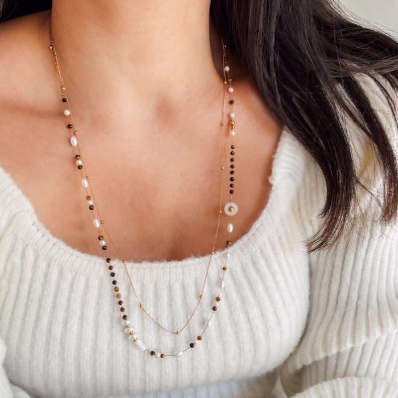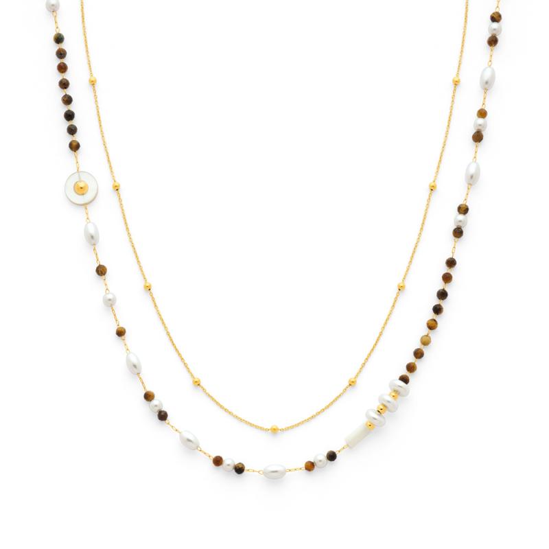 Sautoir double acier doré avec oeil de tigre réglable de 70 à 75 cm